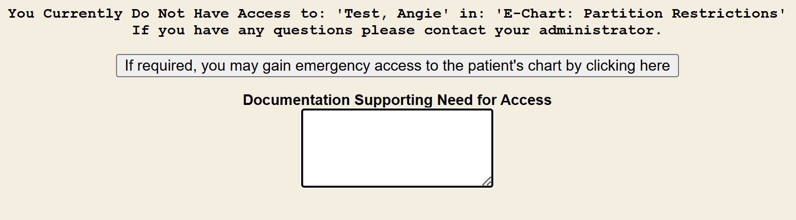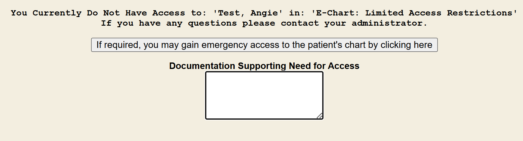 If Allow Emergency Access to Charts is set to Yes: The user can view a restricted chart for a limited time after confirming that access is required for each patient that is requested.