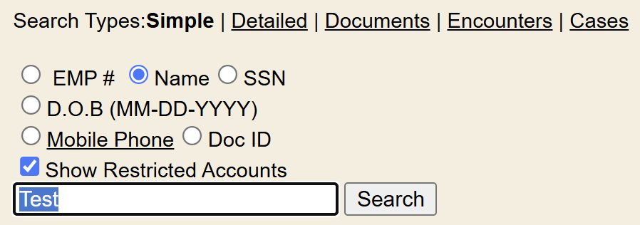 Users with Emergency Limited Access security can see the [] Show Restricted Accounts optional check-box in Simple Patient Search, Detailed Patient Search, & Document Search modes to gain emergency access.