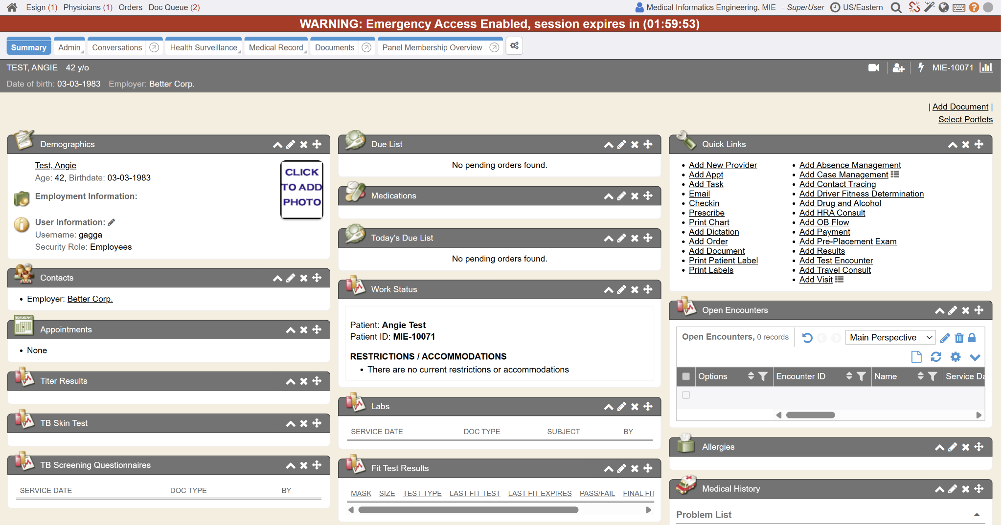 Once the user continues into the restricted patient’s chart, but has emergency access to it, the user will see a banner at the top notifying them that they are in EMERGENCY ACCESS ENABLED mode and their session to work in this patient’s chart expires in a set amount of time. The banner contains how much time is remaining until the record will become locked.