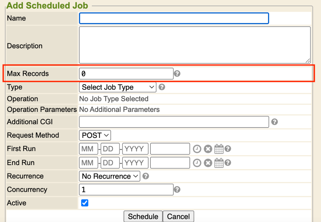 Any active scheduled job with a specific number in the Max Records field of the scheduled job, will terminate the scheduled job once/if the max number of records is hit during that scheduled job. The Max Records field sets a threshold for the number of records processed before requiring approval to continue to execute the scheduled job. The execution of the scheduled job is blocked when the max records count exceeds the row count the scheduled job finds to execute on. Set the Max Records field to zero 0 for no limit.
