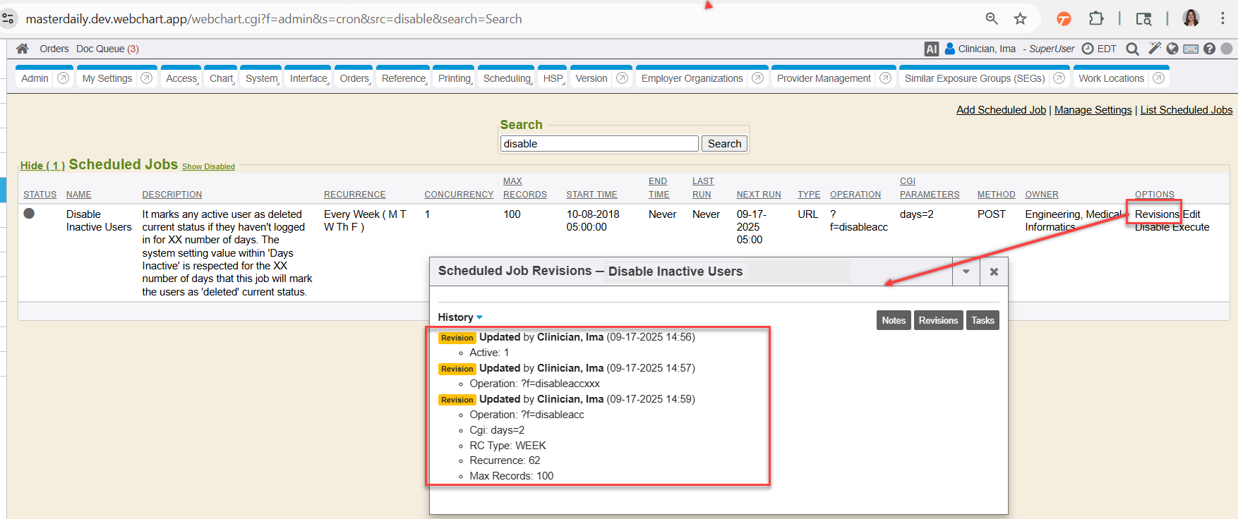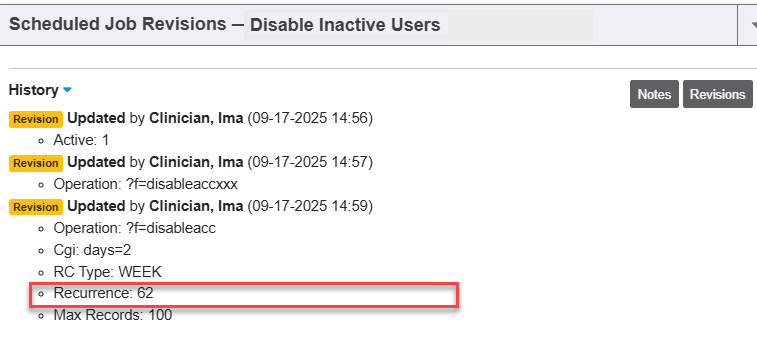 When looking at the Revisions of a scheduled job (in a pop-up window), each revision is listed with whom (user) made a change to the scheduled job, including a date/time stamp of that revision, and which field(s) were revised, and the field(s) revised show what the value or data was entered in by that user during the revision that was saved. Revisions gives a chronological history of any revisions to the scheduled job that was selected to view. Newest revisions would be at the bottom of the pop-up window and oldest revisions at the top.