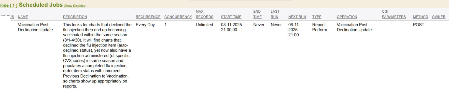 A Vaccination Post Declination Update system report is available to be configured as a scheduled job. This system (when executed) looks for charts that declined the flu injection, but then end up becoming vaccinated within the same season (8/1-4/30). This report (when executed) will find charts that declined the flu injection item (with auto-declined status), yet now also have a flu injection administered (of specific CVX codes) in the same season. If any matching charts are found, the executed report will populate a completed flu injection order item with comment Previous Declination to Vaccination so charts show up appropriately on reports.