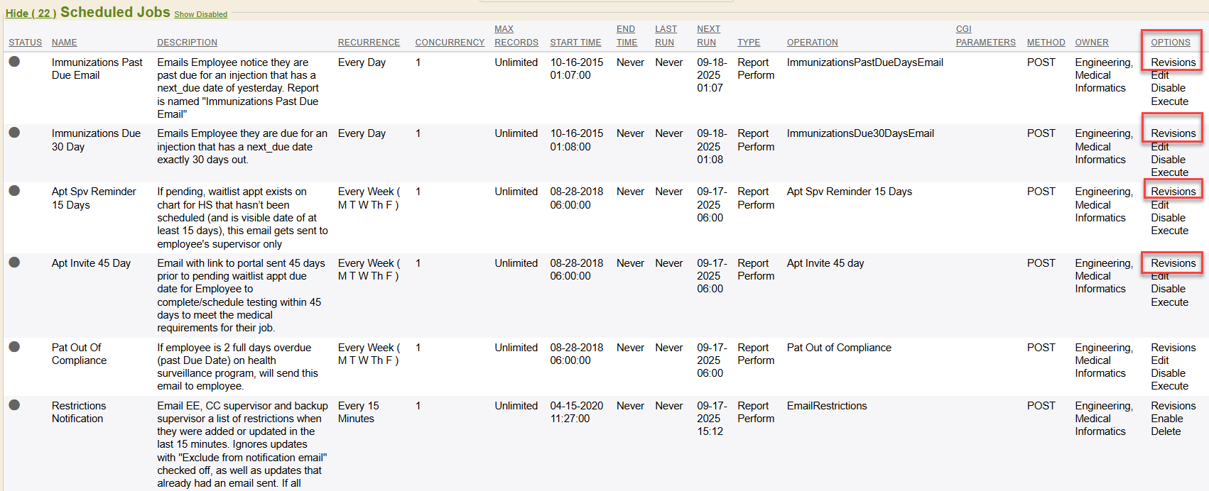 Within the listing of scheduled jobs (whether active or inactive), is an option to view Revisions.