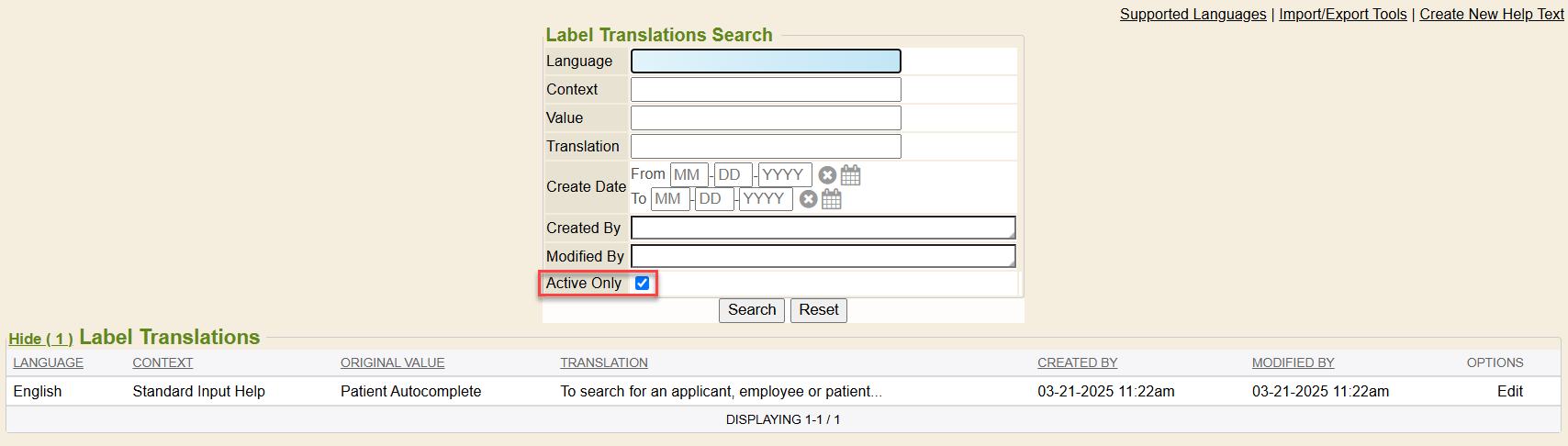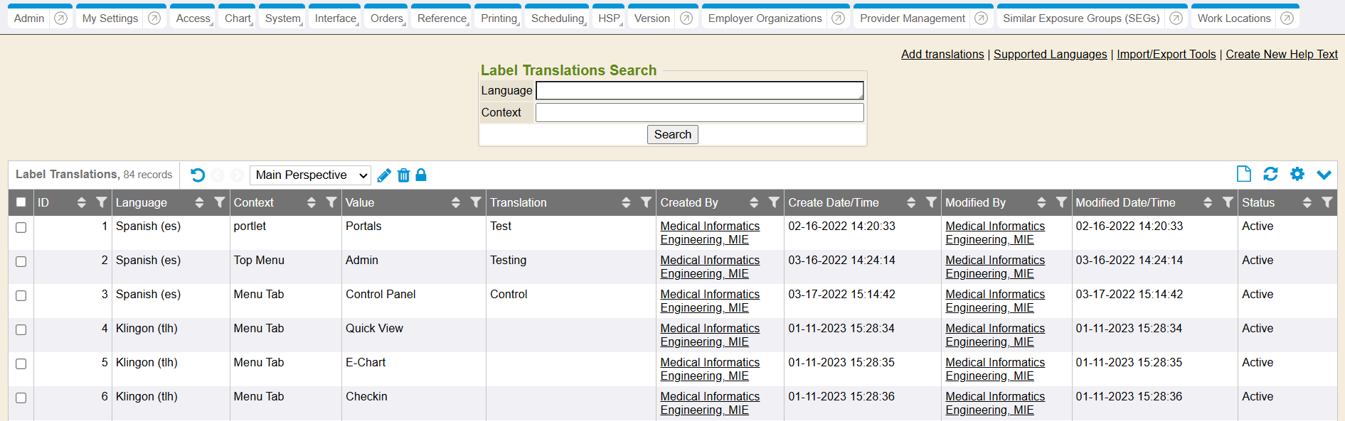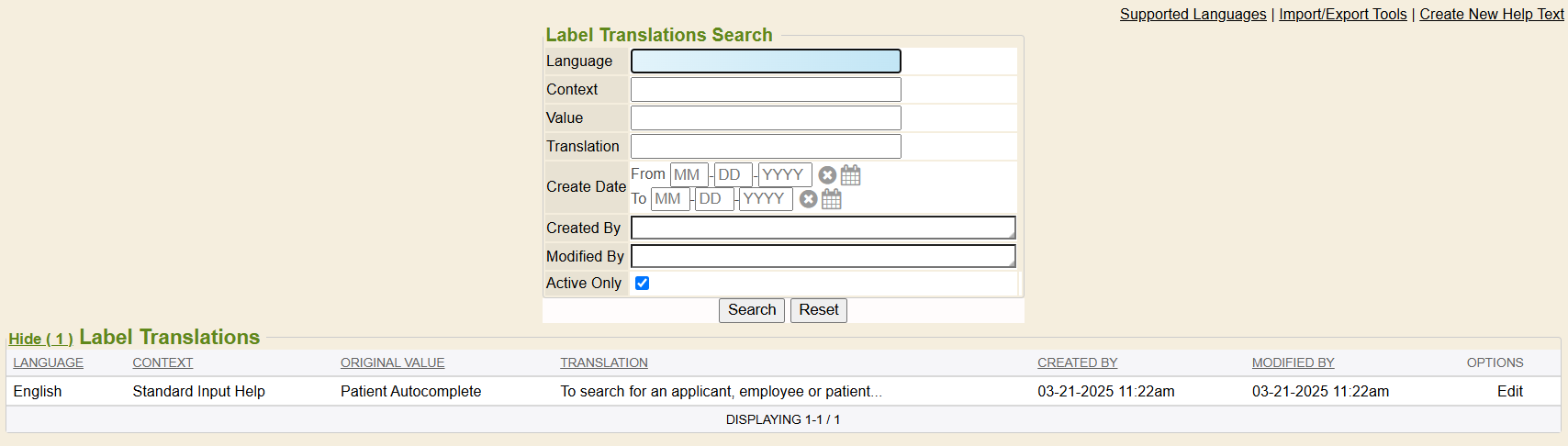 You fill out any filter criteria to find the labeled translation you need and click the SEARCH button to see the results. The Label Translation results return data of which language, the context, the original value & the translation, then who created the translation (user initials/date/time) and if any modifications were done to it then it would show that last modification user initials/date/time.