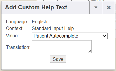 After saving, the help bubble verbiage for the specific selected (value) standard help field will be changed to what you typed into the Translation field. This is an example of help bubble verbiage we changed for patient autocomplete search help (?) bubble: