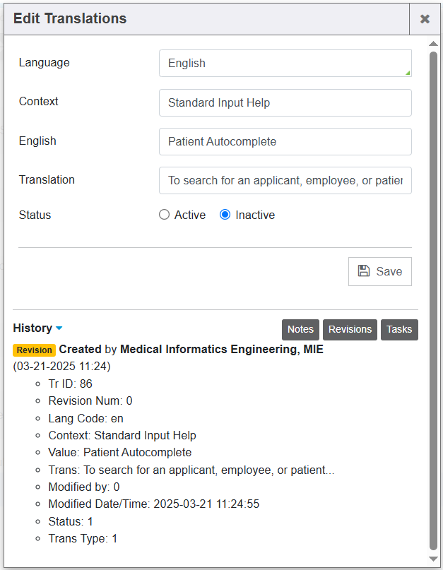 You can also change a translated help bubble verbiage back to what the product default comes with (the hard-coded verbiage) by inactivating the stored custom translation. Simply click the edit hyperlink next to a customized translated standard input help bubble translation, then checkmark the ‘inactive’ checkbox and Save your edit.