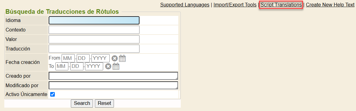 The Language Manager tab also has a link for “Script Translations” that allows convenient translation of some labels. This hyperlink Script Translations will only show/appear if your default language preference is something other than English. So to access this hyperlink, you must have your preferred language set to something other than English (either in the My Settings preference or via the “globe” icon).