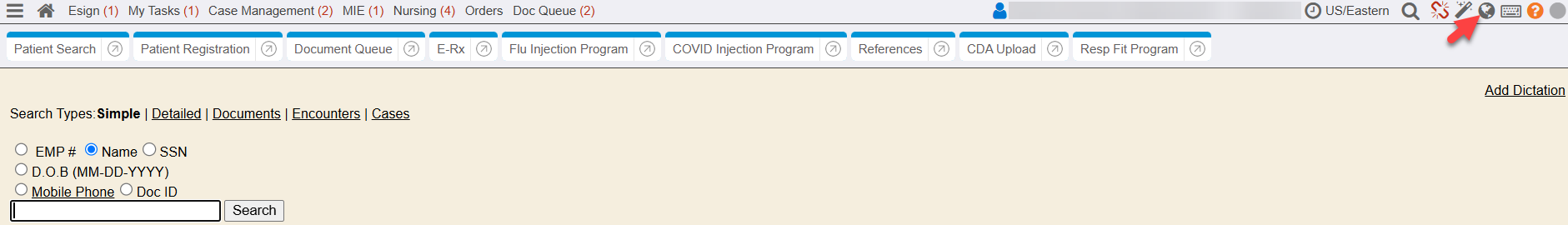 Once the system setting is set with the desired languages to make available, you will see a “world” or “globe” icon at the top right corner of your Enterprise Health system. You can click that to have your Enterprise Health view shown in different languages instead of always going to set preferred language via My Settings preference. The My Settings preference and the “world” or “globe” icon selection are the same thing; same method of changing your language you are viewing. This only affects your user logged in session; it doesn’t change the language for all other users in Enterprise Health .