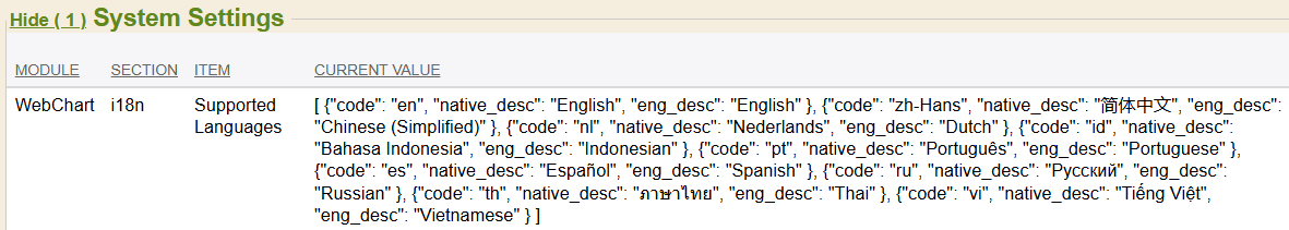 If you want to show Enterprise Health in other supported languages to be able to select and display Enterprise Health in any of our supported languages, you must have the supported languages system setting value set with some JSON programming format. Please contact your MIE Implementer to have set the languages you wish to have your Enterprise Health to offer. The system setting provides each Enterprise Health system to show specified list of languages that Enterprise Health can be shown in via the “globe” icon when working in Enterprise Health .