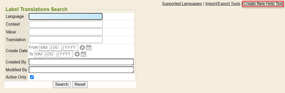 To customize the first time, click the Create New Help Text hyperlink found in the Languages tab.