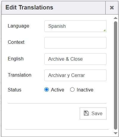 To edit a translation already done, you would click edit in the options column. You can then retype the corrected translation in that field and save. You can inactivate the label translation too.