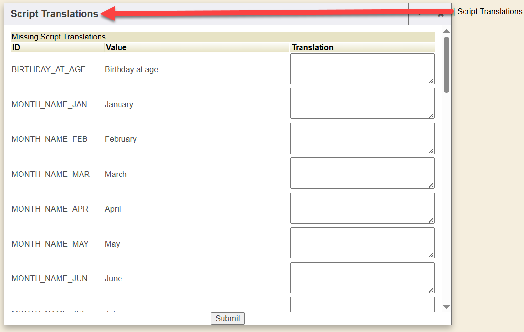 When you click that hyperlink, a pop-up window will appear of some missing script translations (for the language that you are set on). You can see them listed and you can provide a translation for in an easy flowsheet type of method. If it’s a long list, use the inner scroll bar to see the entire listing. Click Submit button to save your translation work.