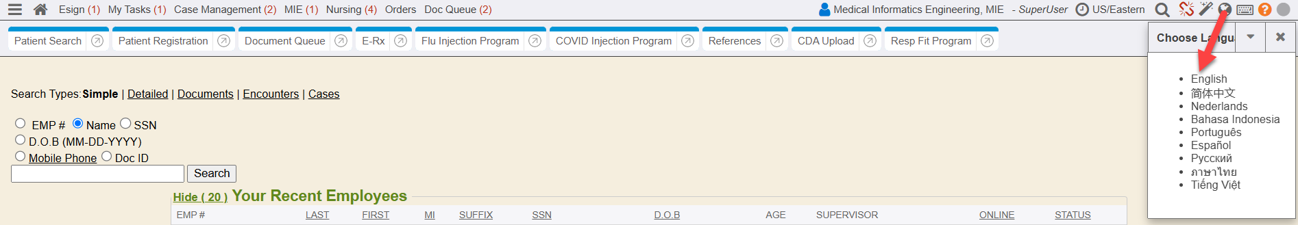 By clicking the “globe” icon, from the drop-down select the language you want Enterprise Health shown in. Your MIE Implementer needs to copy in the specific language(s) files in the db background that you want your Enterprise Health to support.
