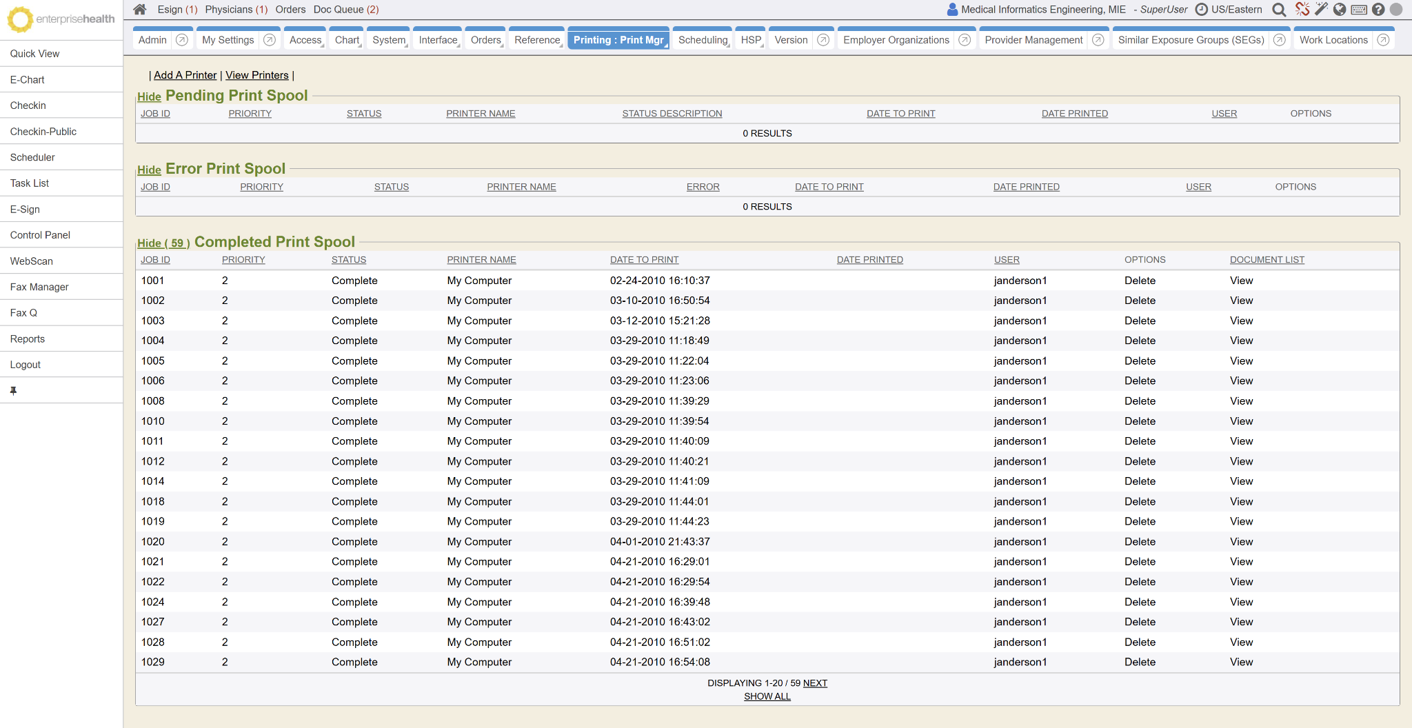 You can click on the Job ID hyperlink to see the printed queue job, but these print jobs are stored as temporary files in the Enterprise Health File System and are only accessible for 7 days. It’s a script on the File system box that does the deletion. For ASP clients, it’s set to 7 days. Other practices on their own server box could be longer IF they have enough disk space to support storing more EH FS temporary files. This includes all thumbnails, decompressed files, and all EH FS Temp files also.
