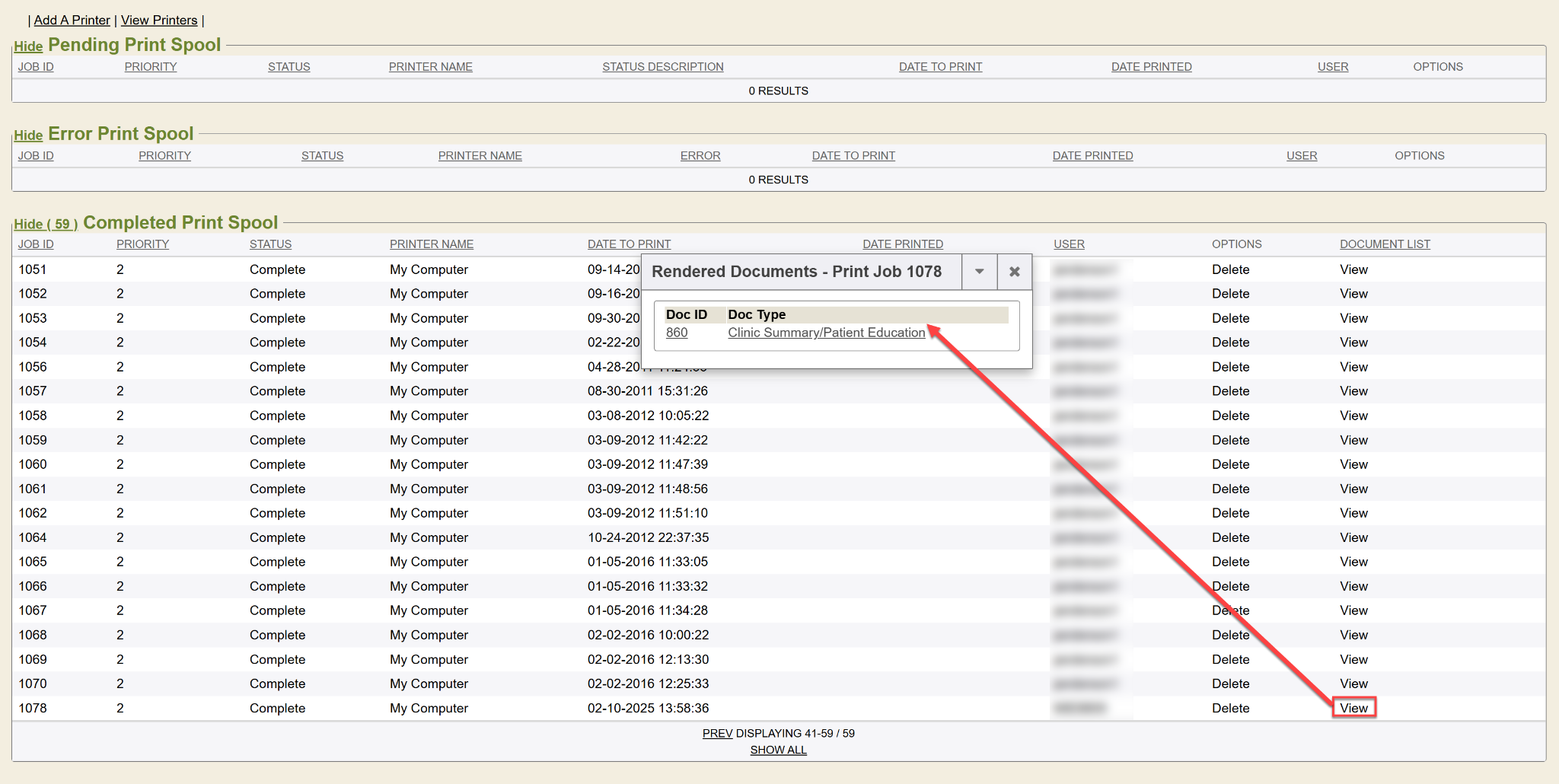 If you click the view link that is available next to the listed Print Job, you will see a text list of doc.id’s and documents that were printed in that print job. This allows you visual of what was printed/rendered and can look up those document ids if needed.