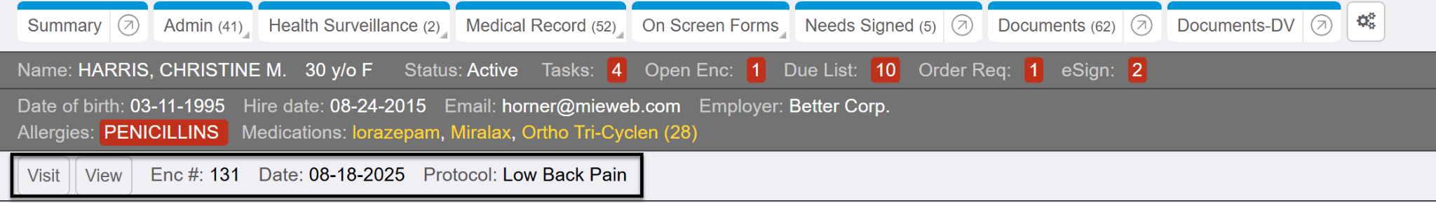 When working in a chart, if the encounter is set as ‘current’ for yourself, you will also see the protocol that the encounter was selected as in the encounter summary toolbar line.