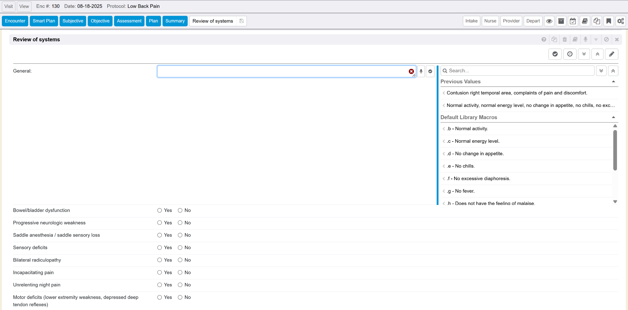 Creating protocols in a system for the ‘Visit’ encounter consists of adding the protocol selector in the Chief Complaint section of the encounter. This will drive the protocol components for the other sections of the encounter; History of Present Illness ( HPI), Review of Systems (ROS), Physical Exam (PE), Tests and Procedures, Quality, Plan Narrative, Patient Education and Depart Instructions. Of course, Enterprise Health system’s default encounter sections can still be used if no specific protocol selection is made to affect those dynamic sections.