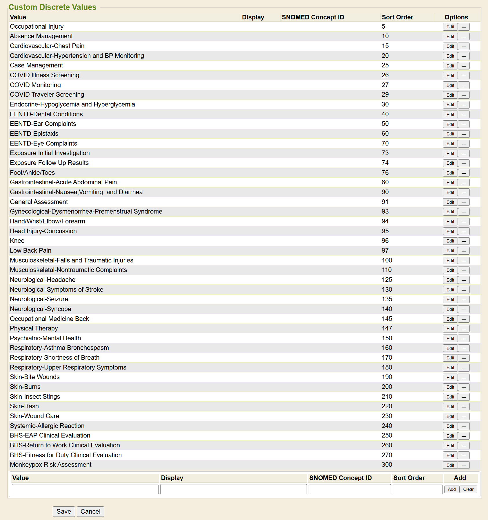 In the Discrete Values section of the Visit Protocol observation, you will key in all the names of the needed protocols, such as ‘Fall’, ‘Burn’ or ‘Chest Pain’, etc and set the order in which they should appear in a drop-down view. Value field: The names keyed in this section will be the names of the protocols the end user will see as a selection choice in the chief complaint of the Visit dynamic encounter. Display field: can leave blank. Sort Order: this is the order in which they will appear to an end user in the protocol autocomplete of the chief complaint section if they use their ↓ down arrow key on a keyboard to see a list of all selections available. Most key these in alphabetical order so the end user sees them alphabetized.