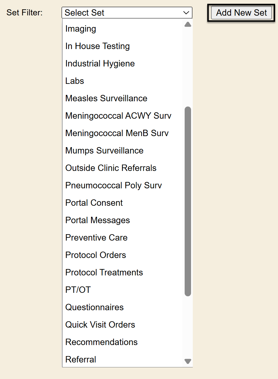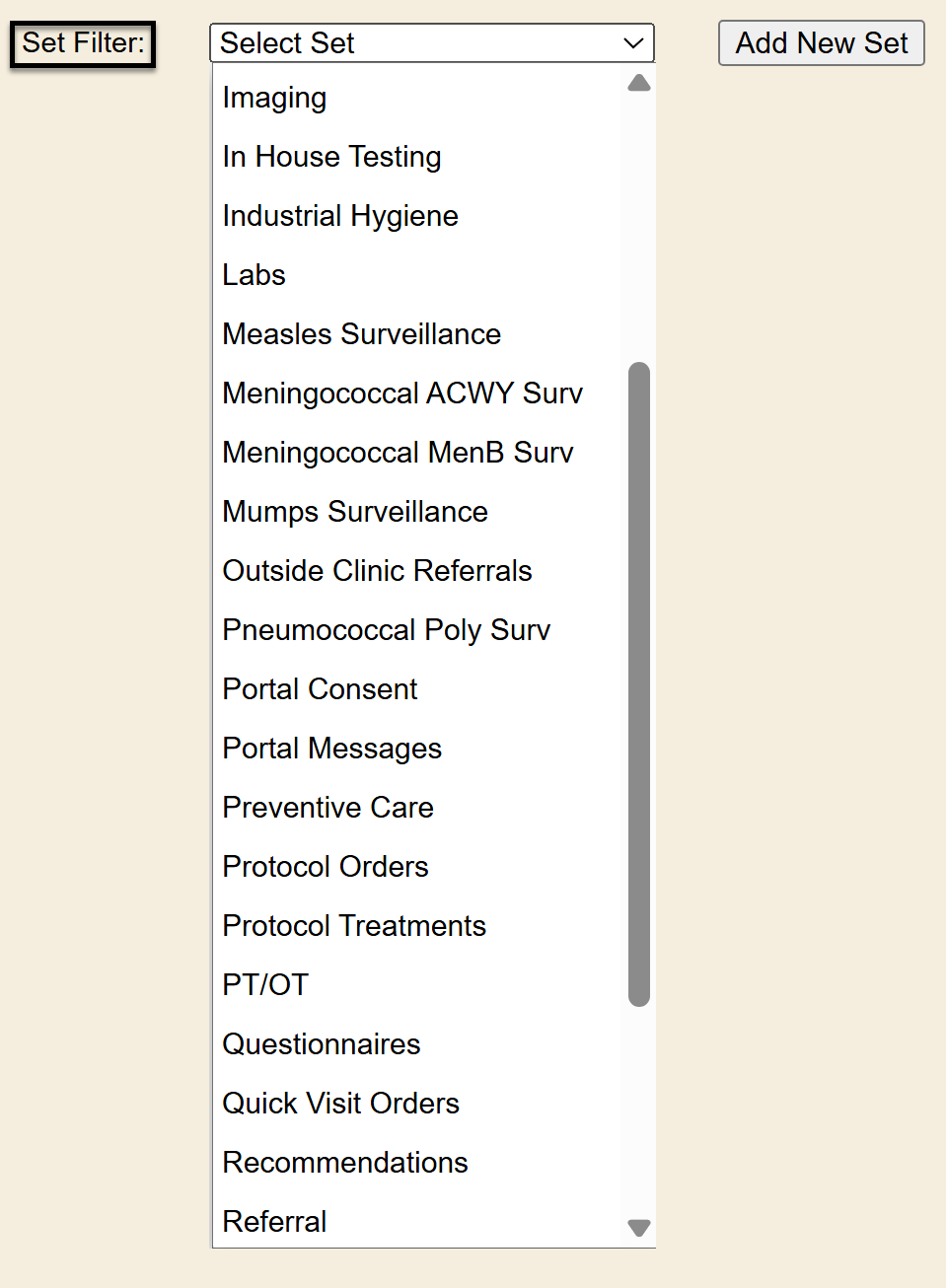 Next the order item must be tied to the Protocol Procedures order picklist. Go to Control Panel sidemenu tab, then to Orders-Pick Builder tab. The screen will display all existing picklists. Use the drop-down in the set filter to see if a picklist named Protocol Procedures exists already or not. If it exists already, click the plus + icon at the top right corner of the title bar of the picklist to add another group & order item set to it (see below instructions).