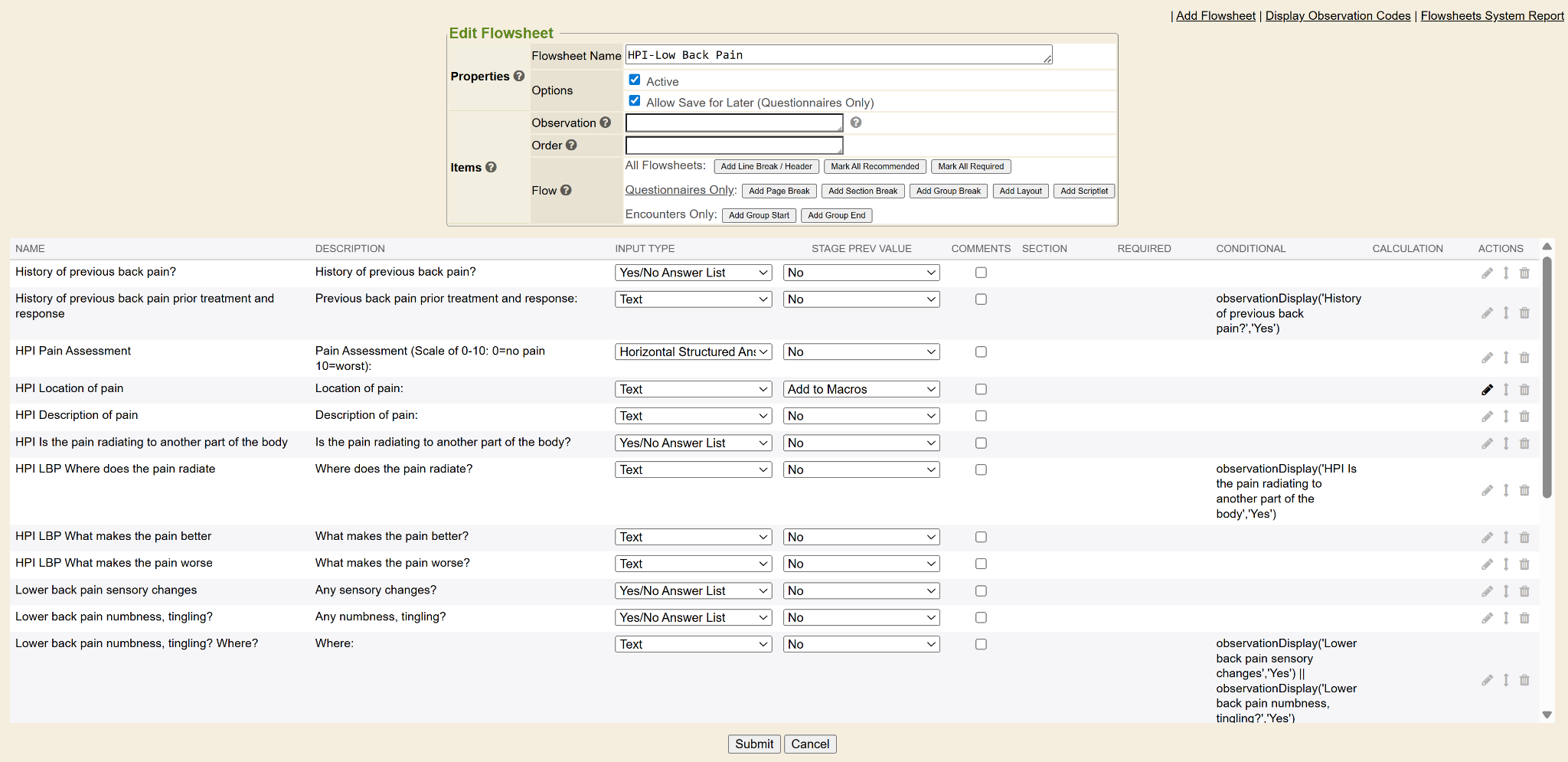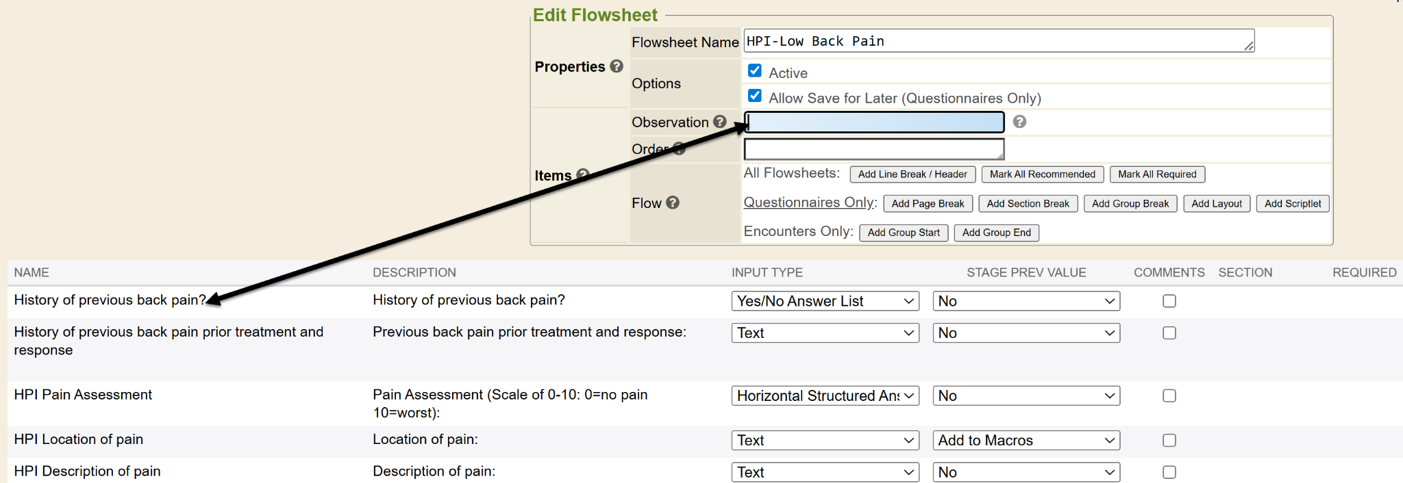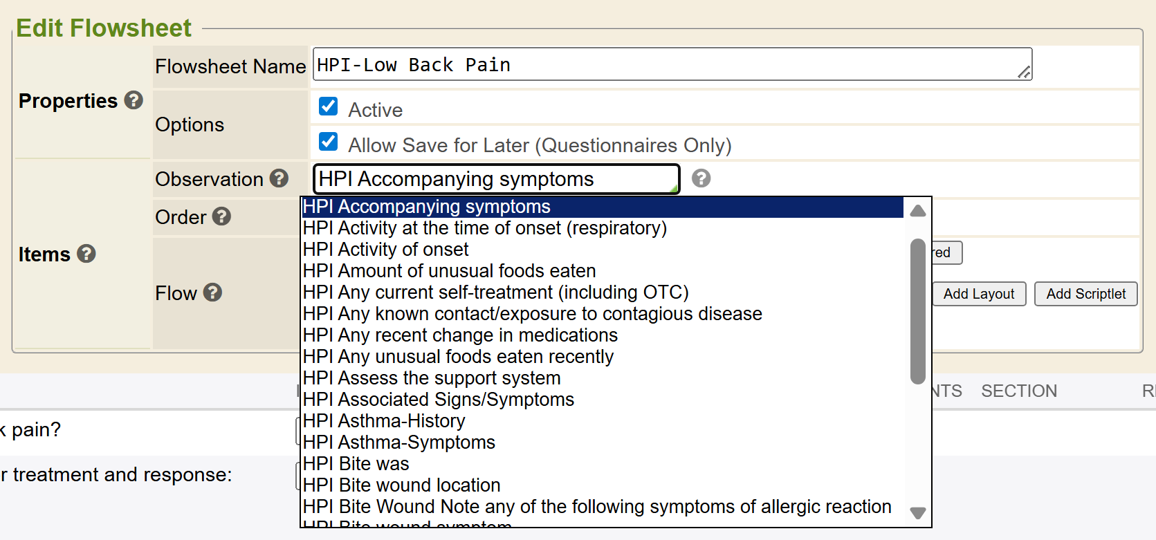 In the following example, the system has a visit protocol named Low Back Pain and we have created HPI observations to be used in the HPI section for the Low Back Pain protocol and am now creating the flowsheet for the HPI section which the system will pull these data entry field questions into the HPI section instead of the default normal HPI section.