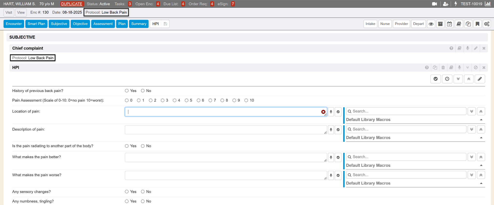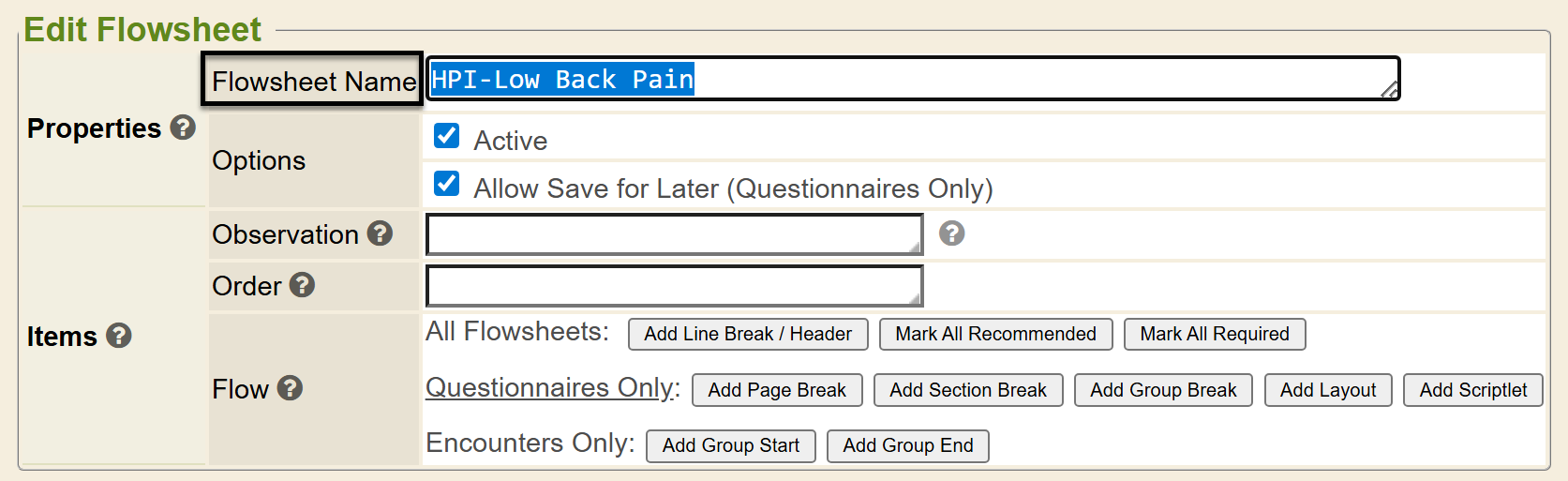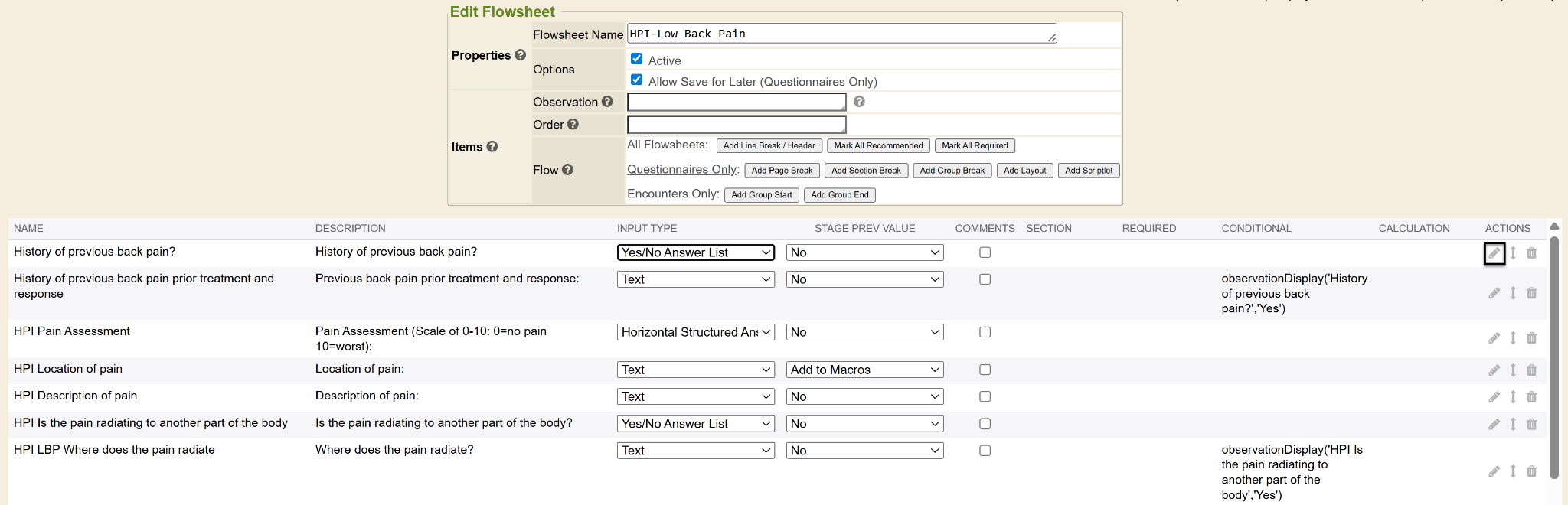 In the following example, the system has a visit protocol named Low Back Pain and we have created HPI observations to be used in the HPI section for the Low Back Pain protocol and am now creating the flowsheet for the HPI section which the system will pull these data entry field questions into the HPI section instead of the default normal HPI section.