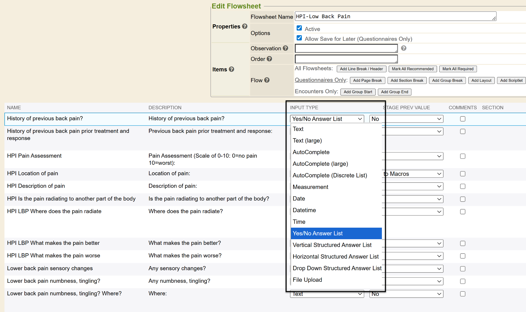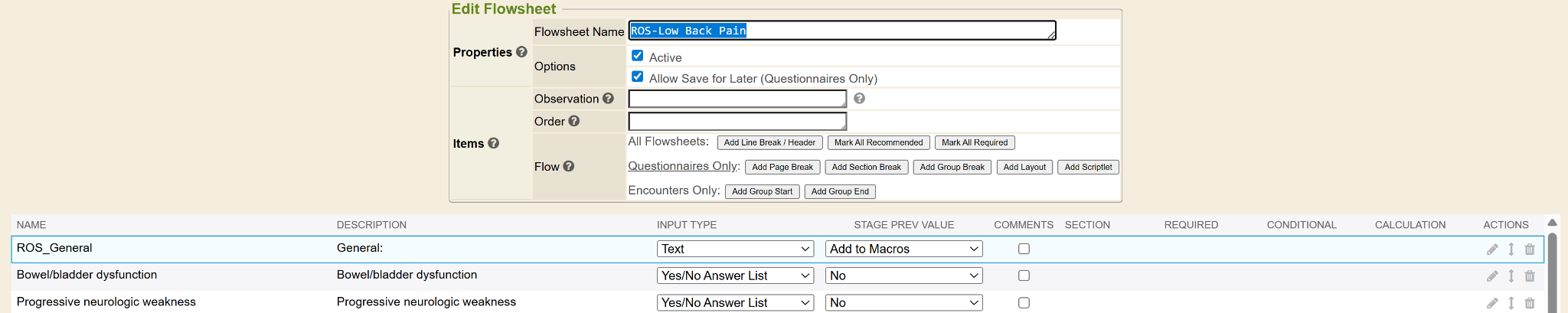Continue to create separate flowsheet and set input type and edit description entries (using previous steps above) for Review of Systems (ROS) encounter section if needed for the protocol. Here is an example of an ROS FLOWSHEET to be used in the Low Back Pain protocol example: