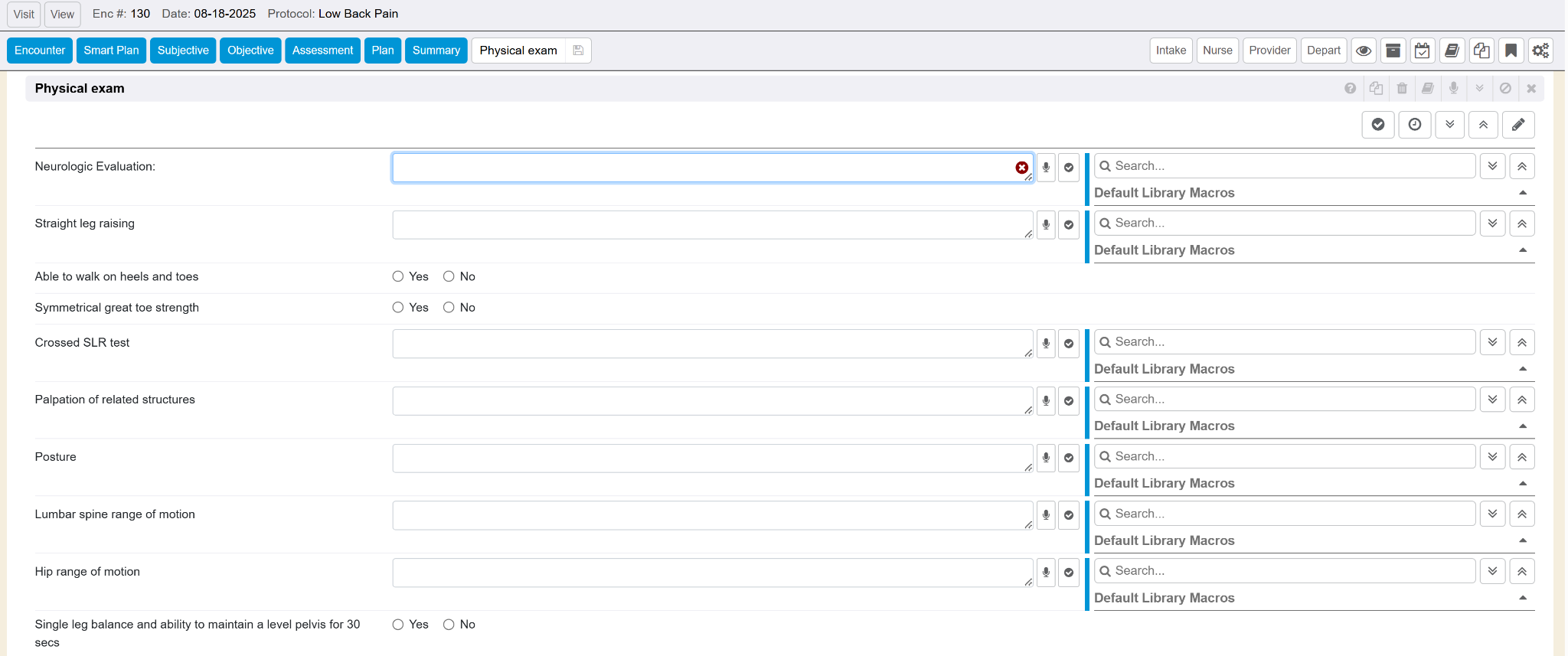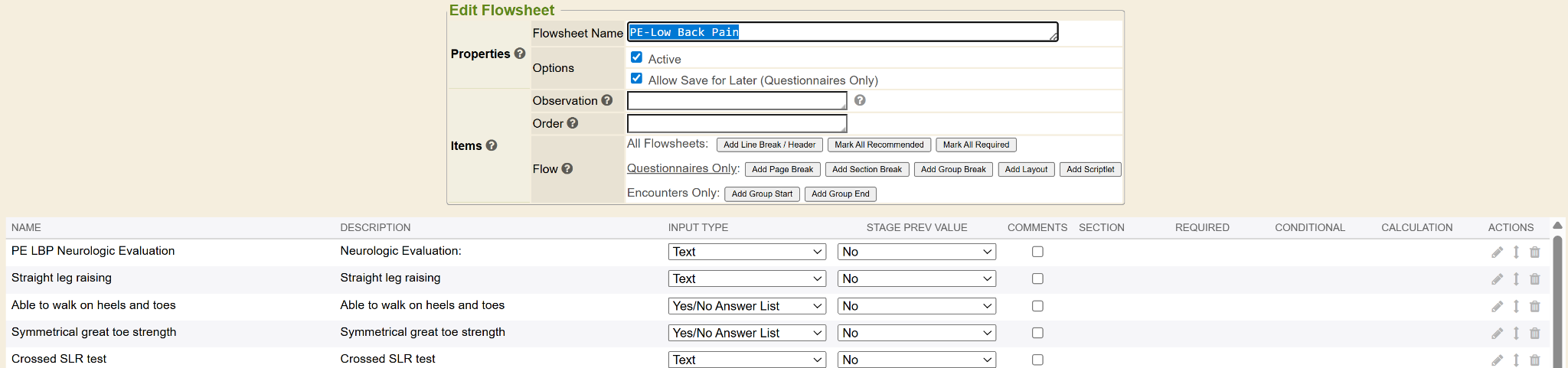 Continue to create separate flowsheet and set input type and edit description entries (using previous steps above) for Physical Exam (PE) encounter section if needed for the protocol. Here is an example of a PE FLOWSHEET to be used in the Low Back Pain protocol example: