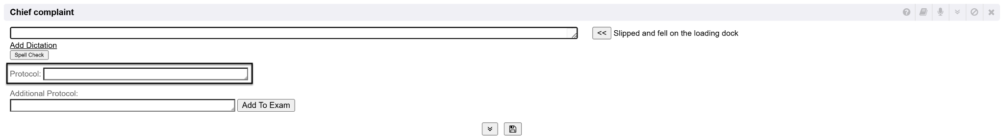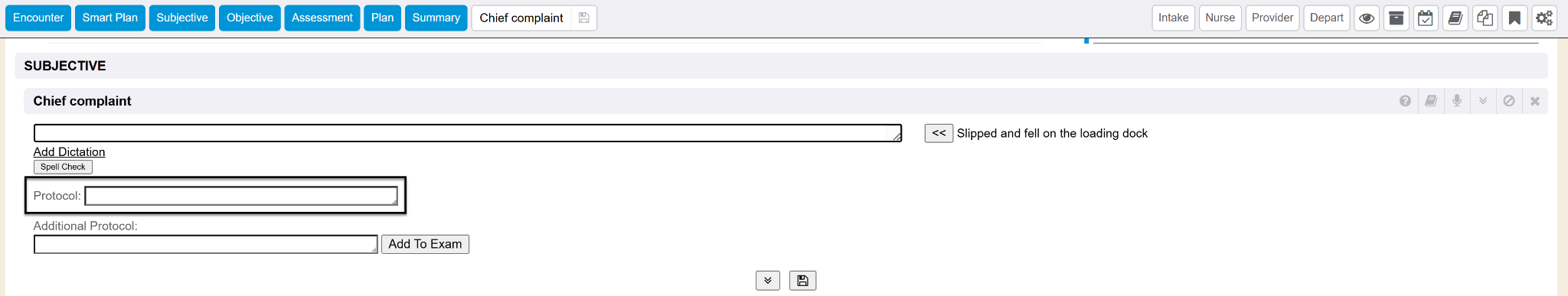 Once this has been done the Protocol autocomplete field (along with the selection choices) will show in the dynamic Visit encounter in the Chief Complaint section. This is an autocomplete box so by using the ‘down arrow’ in this field the list of the protocols will reveal. Otherwise begin typing in the desired protocol to activate the autocomplete selection.