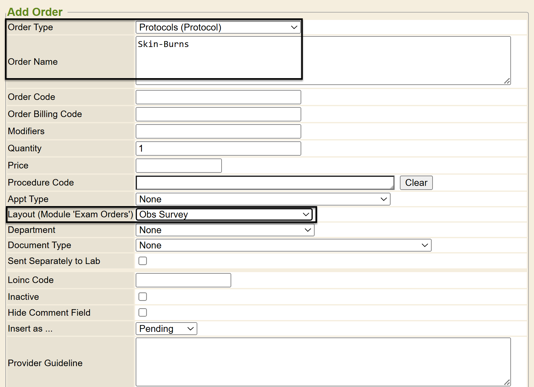 - Order Name: must be the exact matching name of the Visit Protocol which should be the same exact matching name as the Tests & Procedures flowsheet name created in above steps. This is the specific protocol tests & procedures flowsheet that will appear in when selected in an encounter.