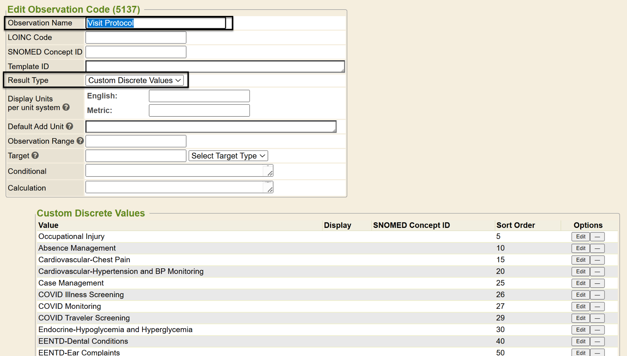 For protocols to show as selections in the Chief Complaint section of the dynamic Visit Encounter, the system needs to have an observation named: Visit Protocol This is done via the sidemenu tab Control, then to Observation Codes tab, then search to make sure one doesn’t exist already. If it does exist already, you will skip to just add protocol selection choices to this existing observation in the discrete values section of the Visit Protocol observation.
