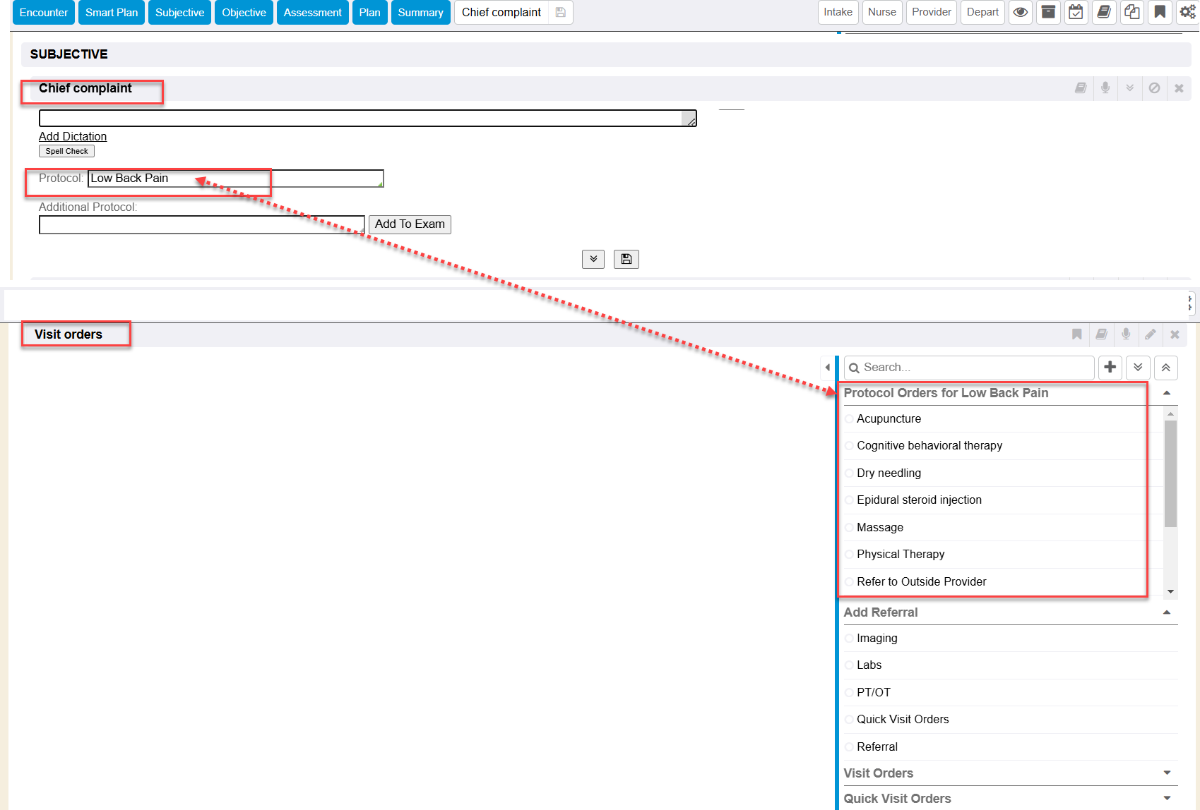 Doing that programming will then make Protocol Order selections appear in the Visit Orders section (expanded method or right side quicklist method) for the matching protocol preselected up in Chief Complaint of the encounter.
