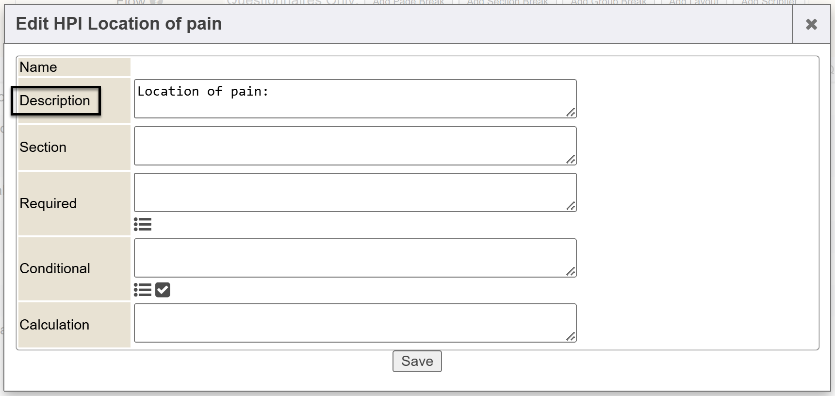 In this example I removed the prefix HPI and added a colon to the verbiage on the description field of the observation. The description is what a user will see in the encounter and what will appear on a stored document. Discrete reporting will render the observation name field that needs to be unique for discrete reporting.
