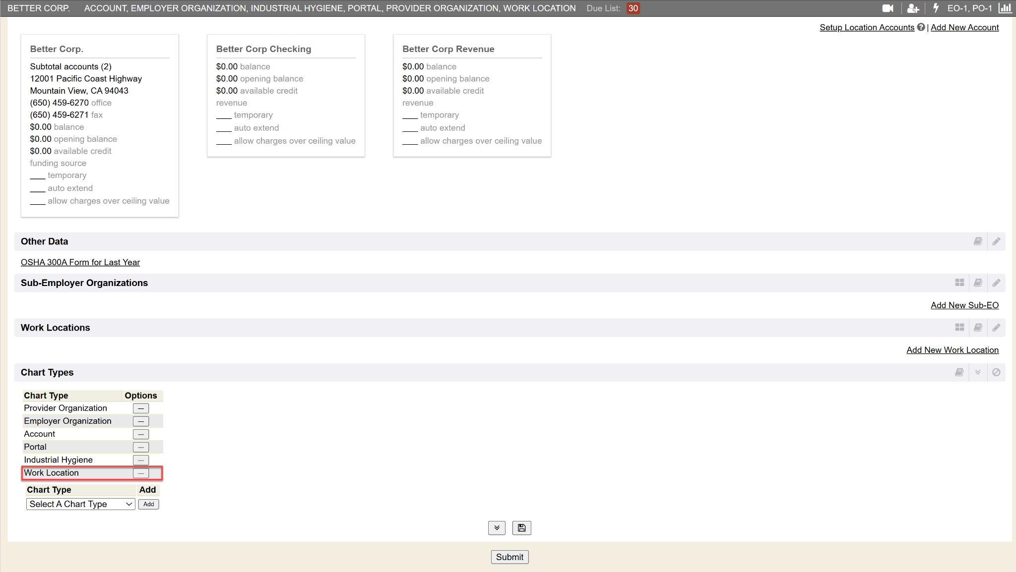 An Employer Organization can also be a Work Location. To create a Work Location from an Employer Organization, click on the Employer Organization tab from the Control Panel. Search for the Employer Organization and click on it. Click on the gray bar for the Chart Types section of the Summary tab. Select Work Location from the dropdown of Chart Types and Save. This will create the Work Location.