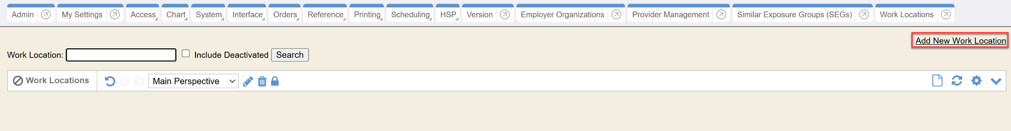 When you click Work Locations from the Control Panel sidemenu tab, the search screen displays. If you click the Search button, all active Work Locations will be displayed. To add a new Work Location, click on the Add New Work Location hyperlink.