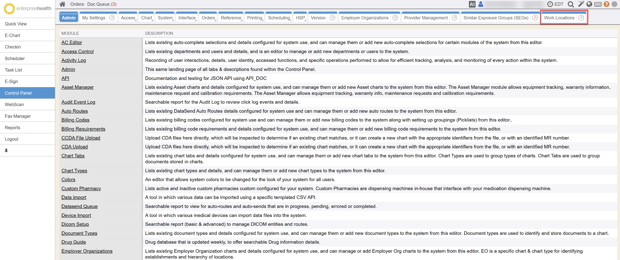The Work Locations tab is found in the Control Panel sidemenu tab.