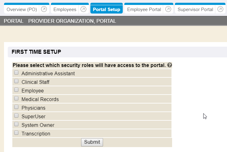 To begin using the First Time Setup, click the section header to expand and display the options. Once opened, security roles may be selected to indicate which roles have access to the portal.