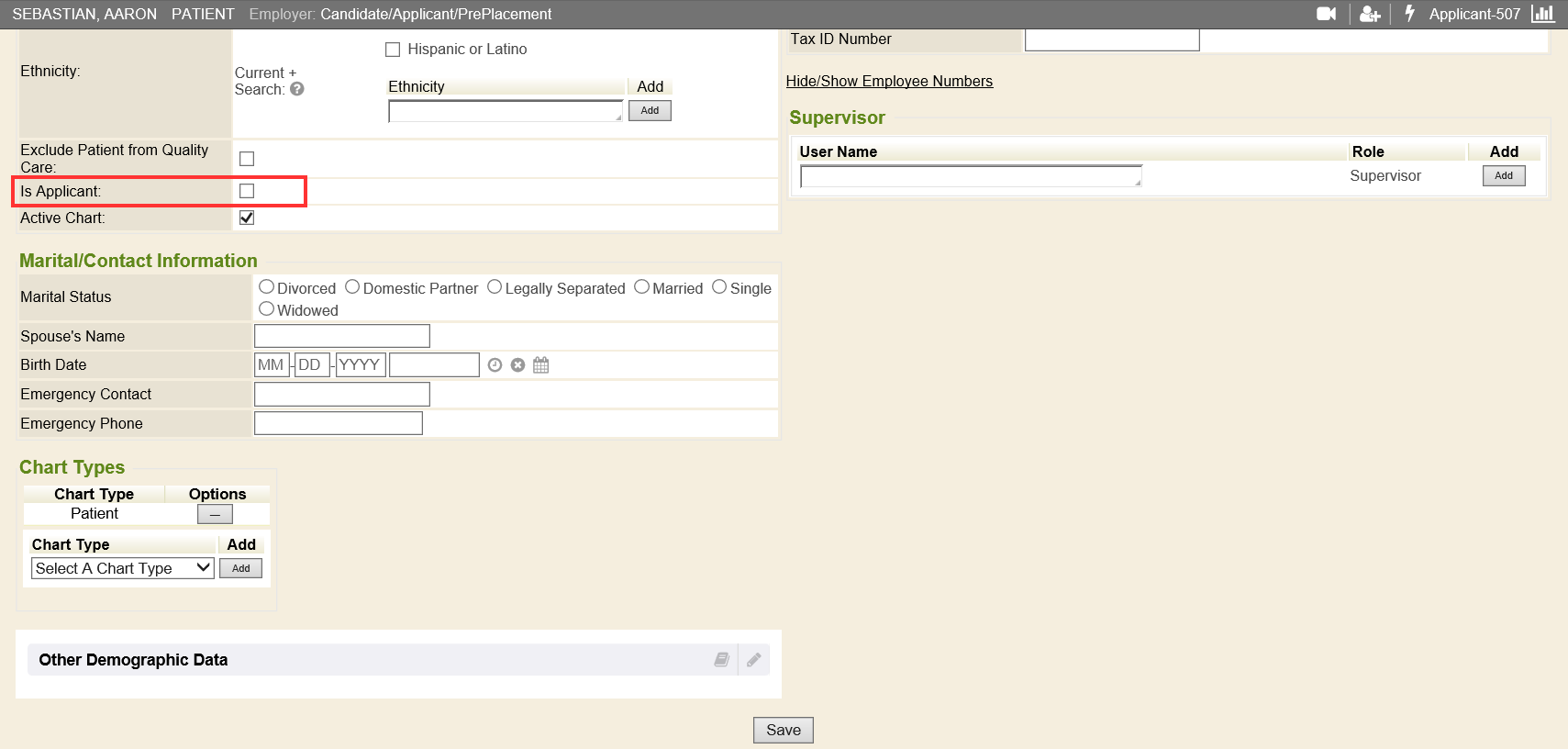 In the edit demographics screen, checkmark the Is Applicant box and click Save to save your work.