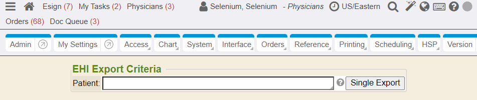 To perform an export, a user should navigate to Control Panel->Interfaces->EHI Export. A user can then select the patient from the autocomplete and click the Single Export button.