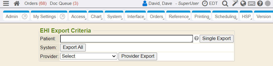 System administrators and superusers have access to perform an EHI Export for a single patient, a set of patients for a single provider, or all patients in their system.